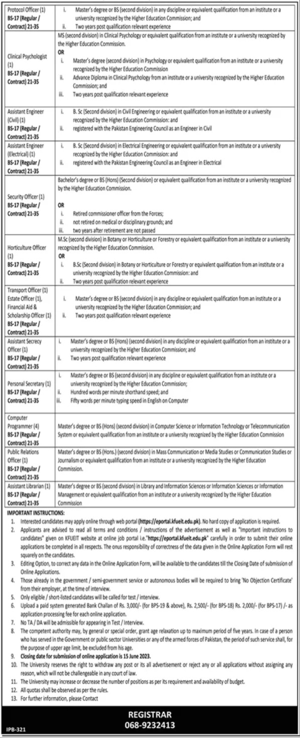 Khawaja Fareed University of Engineering & Information Technology invites applications for job positions advertised in daily Dunya dated 30 May 2023 for following vacancies in Rahim Yar Khan, rahim yar khan Punjab Pakistan.