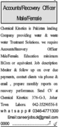 Chemical Kinetics Pvt Limited Lahore, lahore Punjab Pakistan invites applications from eligible candidates for the post of recovery officer and accounts officer as per advertisement of June 2, 2025 published in daily Khabrain Newspaper. Preferred Education is Bachelor, B.com, BBA and Others etc.