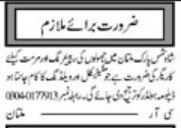 Private Company invites applications for job positions advertised in daily Khabrain dated 13 February 2022 for following vacancies in Multan Punjab Pakistan.