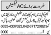 Private Industry jobs advertisement dated about 17 February 2025 in daily Khabrain Newspaper invites application for the vacant post of ac technician and field worker in Lahore, lahore Punjab Pakistan. Intermediate, Matric and Middle etc. educational qualification will be preferred.