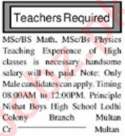 Nishat Boys High School is looking for candidates for following posts as per job advertisement published in daily Khabrain Newspaper of August 22, 2022 for location Multan, multan Punjab Pakistan: