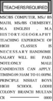 Nishat Boys High School invites applications for job positions advertised in daily Khabrain dated 22 January 2024 for following vacancies in Multan, multan Punjab Pakistan.