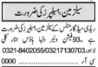 Garments Shop jobs advertisement dated about 28 July 2025 in daily Khabrain Newspaper invites application for the vacant post of salesman and helper in Anarkali Lahore, lahore Punjab Pakistan. Preferred Education is Intermediate, Middle and Matric etc.