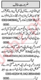 Private Company jobs advertisement dated about 4 December 2023 in daily Khabrain Newspaper invites application for the vacant post of mechanical engineer, field worker, office boy, manager, accountant, supervisor, driver, call operator, clerk, engineer, front desk manager, cashier and mechanical diploma holder in Lahore, lahore Punjab Pakistan. BA, Intermediate, Middle, DAE, B.E, Matric and Bachelor etc. educational qualification will be preferred.