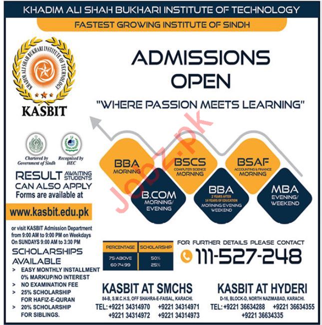 Khadim Ali Shah Bukhari Institute of Technology has announced admissions in BBA, BS Computer Science, BS Accounting and Finance, B.Com and MBA in Karachi.. Read newspaper ad for exact details.