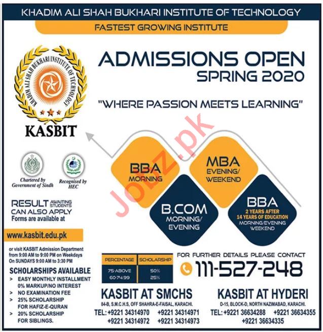 Khadim Ali Shah Bukhari Institute of Technology KASBIT has announced admissions in Bachelor of Business Administration BBA, Master of Business Administration MBA & Bachelor of Commerce B-Com in Karachi. Read newspaper ad for exact details.