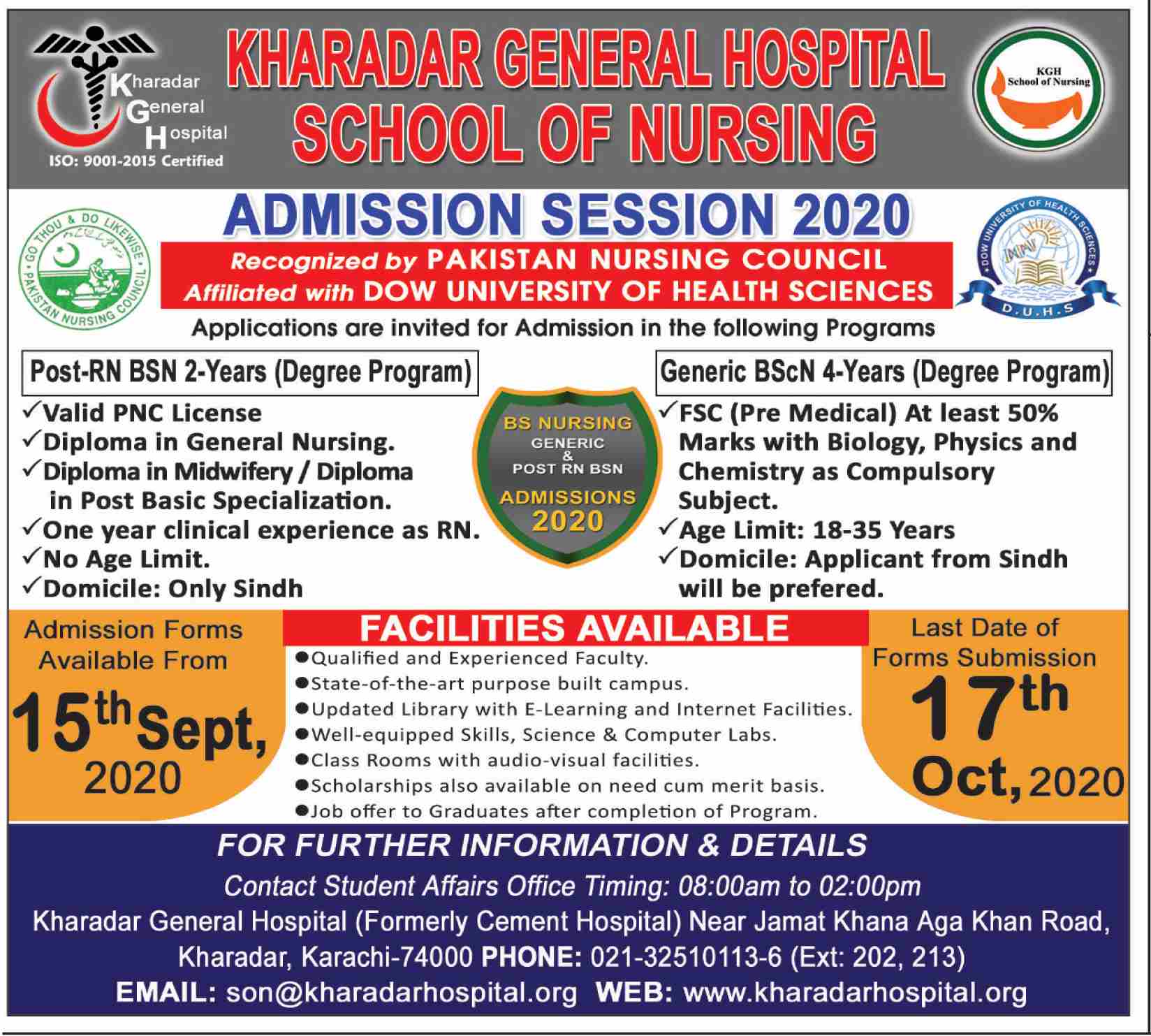 Kharadar General Hospital, School of Nursing Recognized by Pakistan Nursing Council Affiliated with DOW University of Health Sciences is offering admissions in Post RN BSN and Generic BScN in Karachi. Read newspaper ad for exact details.