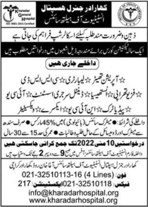 Admissions in Kharadar General Hospital 2022 for Course, Operation Theater, Laboratory, CSSD, Physiotherapist, Anesthesia, Dental Surgery Assistant, ICU, NICU, X Ray, Vaccinator has been announced. Eligible students who qualify as per admission criteria in Kharadar General Hospital Karachi Sindh Pakistan can apply in Medical Medical College for academic year 2022. Eligible students for fulfilling criteria for admissions in Course can enroll as per Government admission policy 2022 till closing date 10 May 2022. Read newspaper ad for exact details.