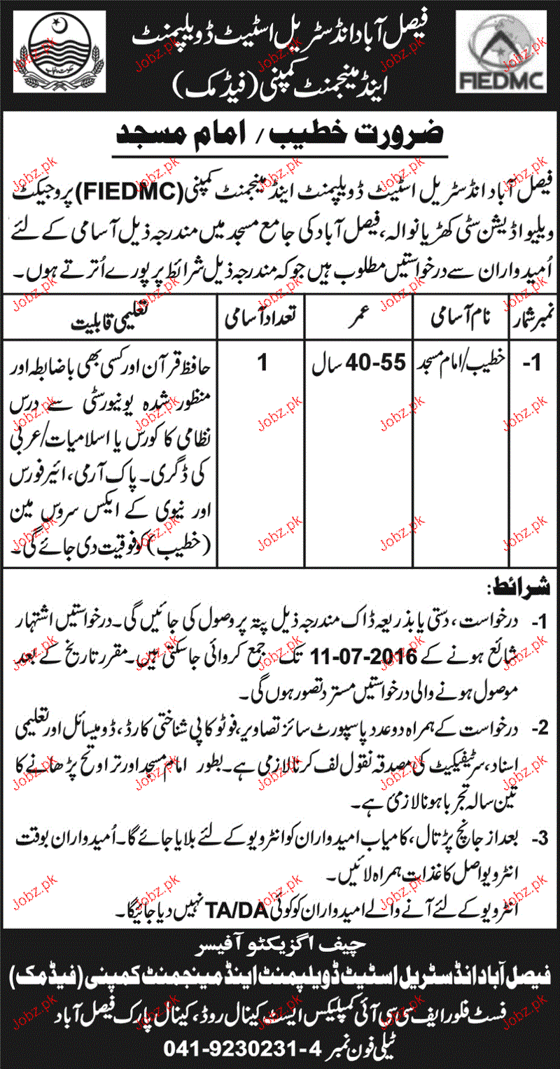 Khateeb / Immam Mosque Job In Faisalabad Industrial Estate