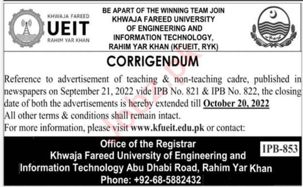 Vacant posts including Assistant Professor Hn Dietition, Assistant Professor Data Science, Assistant Professor Biomedical Engineering, Professor Computer Science, Assistant Professor Chemical Engineering, Professor Law, Assistant Professor Information Technology, Assistant Professor Zoology, Professor Islamic Studies, Assistant Professor Material Science, Assistant Professor Pak Study, Professor English, Assistant Professor Polymer Engineering, Assistant Professor Economics, Professor Physics, Assistant Professor Physics, Professor Chemistry, Professor Chemical Engineer, Assistant Professor Accounting Finance, Assistant Professor Horticulture, Professor Electrical Engineer, Assistant Professor Biochemistry, Professor Civil Engineer, Assistant Professor Artificial Intelligence, Professor Biotechnology, Assistant Professor Commerce, Assistant Professor Bioinformatics, Assistant Professor Computer Engineering, Professor Mechanical Engineering, Assistant Professor International Realtion, Assistant Professor Chemistry, Assistant Professor Environmental Science, Assistant Professor English, Professor Maths, Professor Zoology, Professor Business Administration, Professor Education, Professor Fine Arts, Assistant Professor Cyber Security, Assistant Professor Software Engineering, Professor Computer Engineer, Assistant Professor Management Sciences, Professor Food Science, Assistant Professor Environmental Engineering, Assistant Professor Biomedical Science, Assistant Professor Physical Education, Assistant Professor Quality Management, Assistant Professor Forensic Science, Assistant Professor Maths, Assistant Professor Food Science, Assistant Professor Microbiology, Assistant Professor Mechanical Engineering, Professor Agriculture Engineering, Assistant Professor Agriculture Engineering, Assistant Professor Civil Engineering, Assistant Professor Electrical Engineering, Assistant Professor Animal Science, Assistant Professor Computer Science, Professor Information Technology, Assistant Professor Botany and Assistant Professor Material Engineering are announced in Khawaja Fareed University of Engineering & Information Technology Rahim Yar Khan, rahim yar khan Punjab Pakistan as per 2 October 2022 advertisement in daily Jang Newspaper. Preferred Education is MS, Mphil, Bachelor, Master and Phd etc.