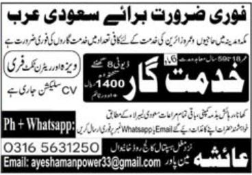 Ayesha Manpower Services jobs advertisement dated about 12 March 2022 in daily Mashriq Newspaper invites application for the vacant post of khidmatgar in Makkah, makkah and madina Saudi Arabia. Persons with Middle and Matric etc. education can apply.