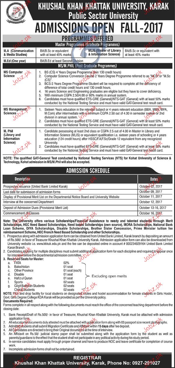 Khushal Khan Khattak University Admission in BS and MS in Karak. Read newspaper ad for exact details.