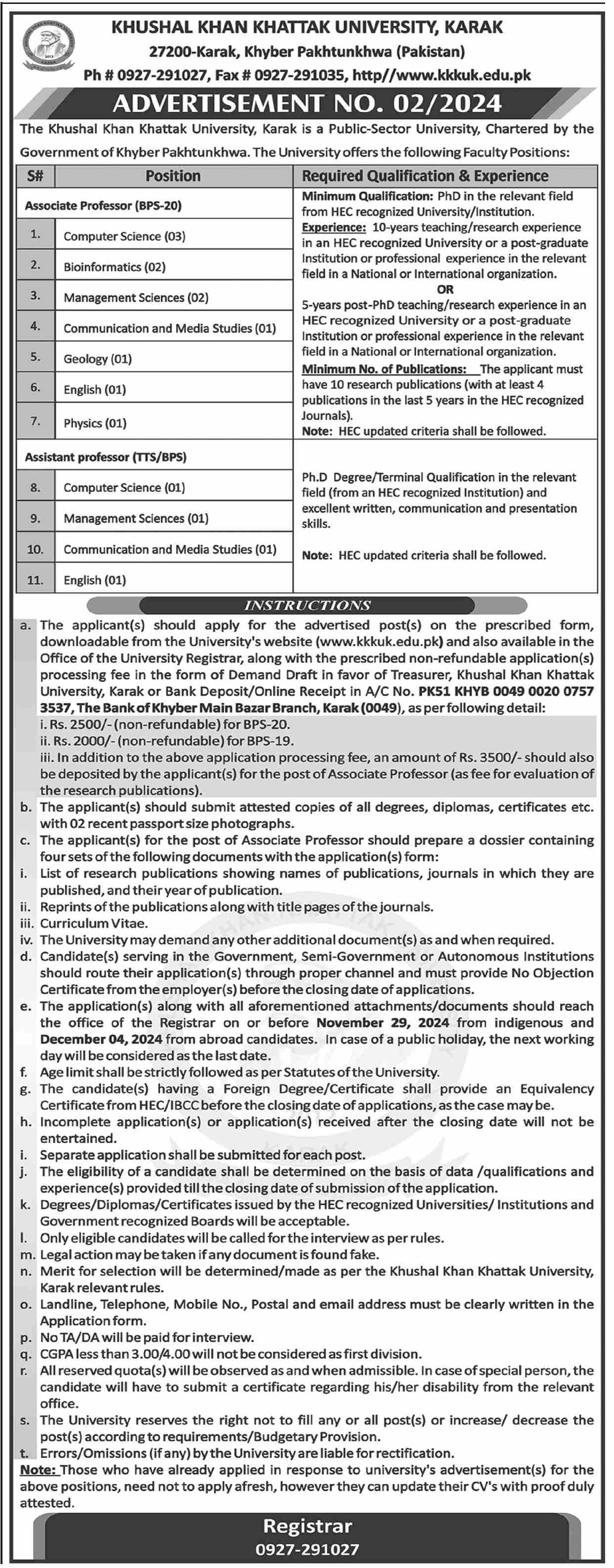 Khushal Khan Khattak University Karak, karak Khyber Pakhtunkhwa KPK Pakistan invites applications from eligible candidates for the post of associate professor, assistant professor, associate professor geology, associate professor media studies, associate professor communication, associate professor physics, associate professor english, associate professor management sciences, associate professor computer science and associate professor bioinformatics as per advertisement of November 14, 2024 published in daily Dawn Newspaper. Educational qualifications required Master, Mphil and Phd etc.