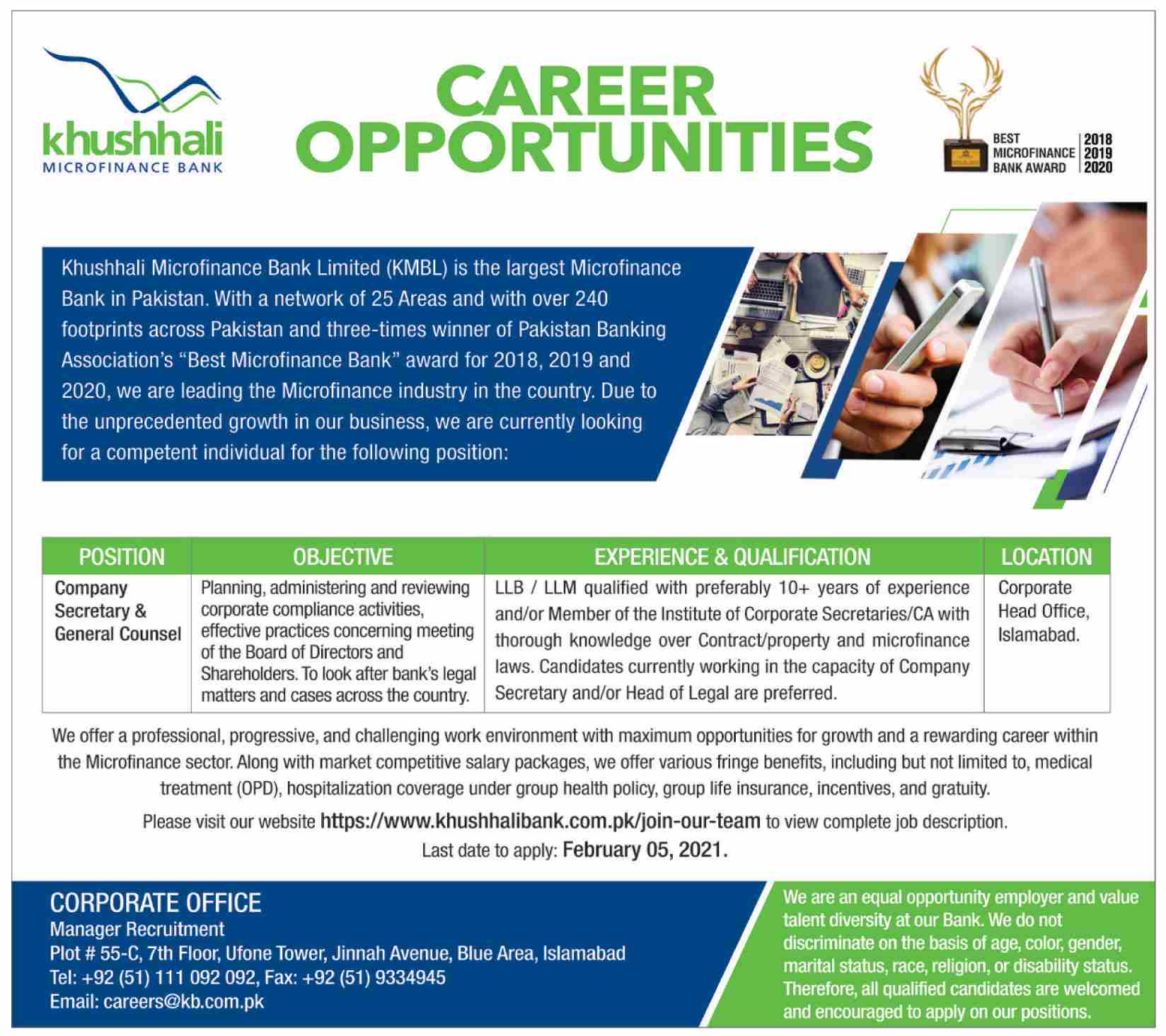 Vacancies in Khushhali MicroFinance Bank Ltd Advertisement January 2021