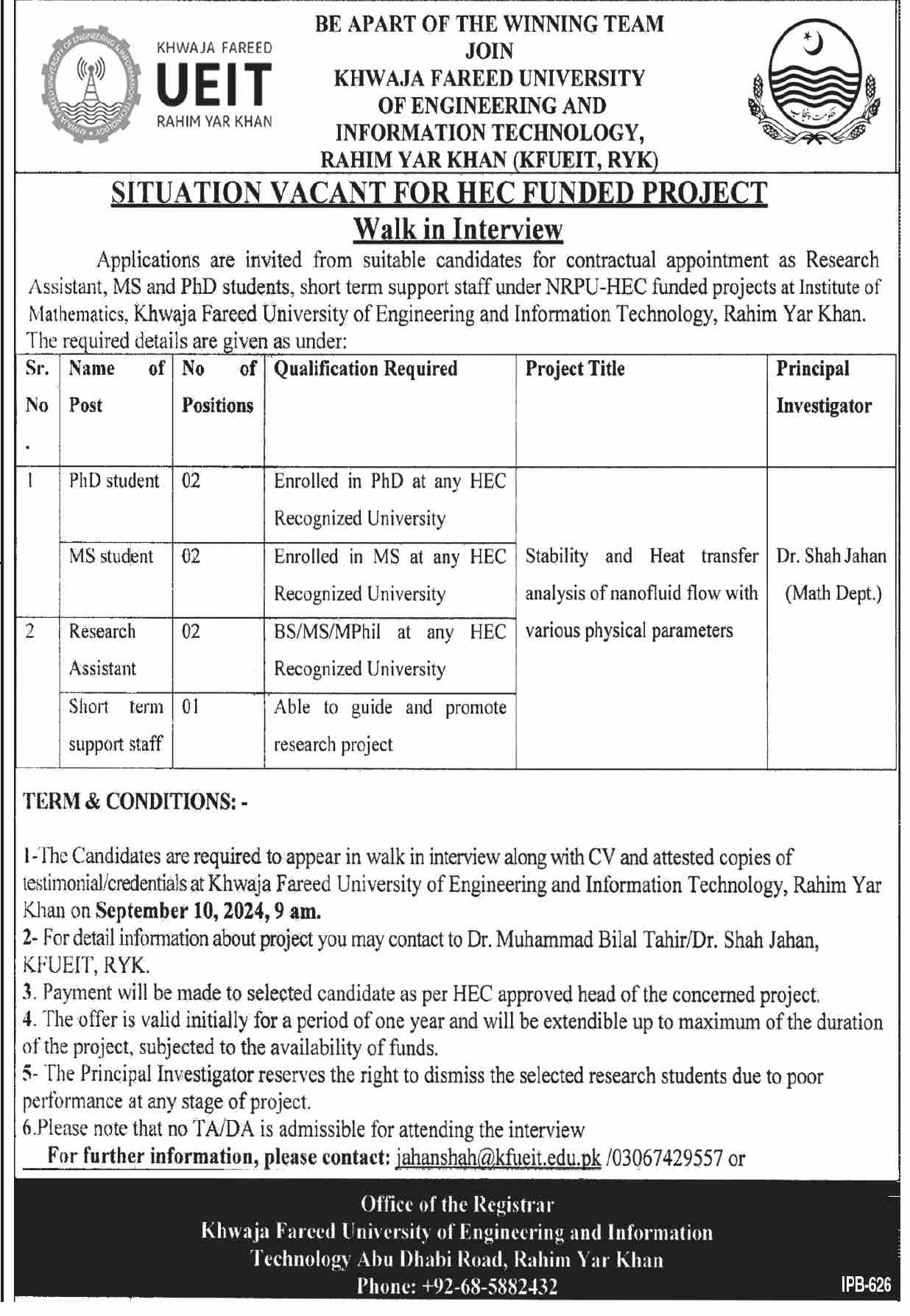 Vacant posts including ms student, short term support staff, research assistant and phd student are announced in Khwaja Fareed University Of Engineering & Information Technology Rahim Yar Khan, rahim yar khan Punjab Pakistan as per 29 August 2024 advertisement in daily Dawn Newspaper. Educational qualifications required Mphil, Bachelor, Phd and Master etc.