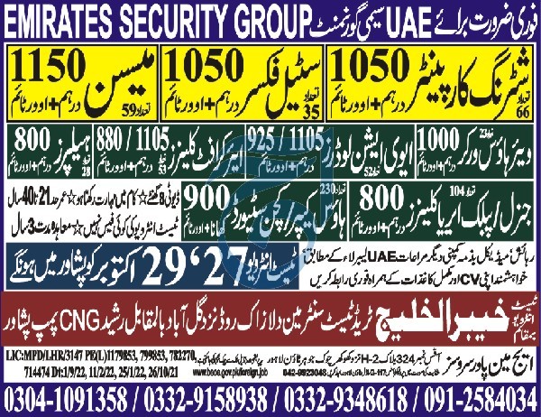 Khyber Alkhaleej Trade Test Center jobs advertisement dated about 25 October 2022 in daily Aaj Newspaper invites application for the vacant post of ware house worker, shuttering carpenter, mason, steel fixer, helper, kitchen steward, public area cleaner, aviation loader and air craft cleaner in Abu Dhabi, abu dhabi UAE. Middle, Primary and Matric etc. educational qualification will be preferred.
