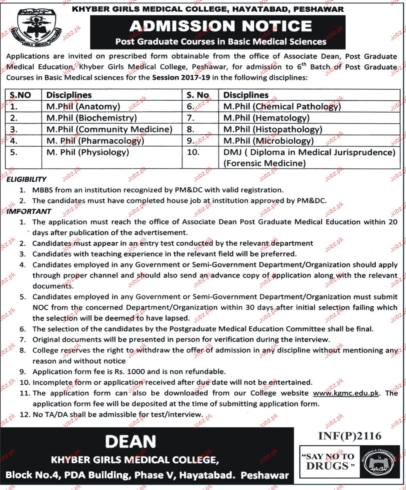 Khyber Girls Medical College Admission in PGD in Peshawar. Read newspaper ad for exact details.