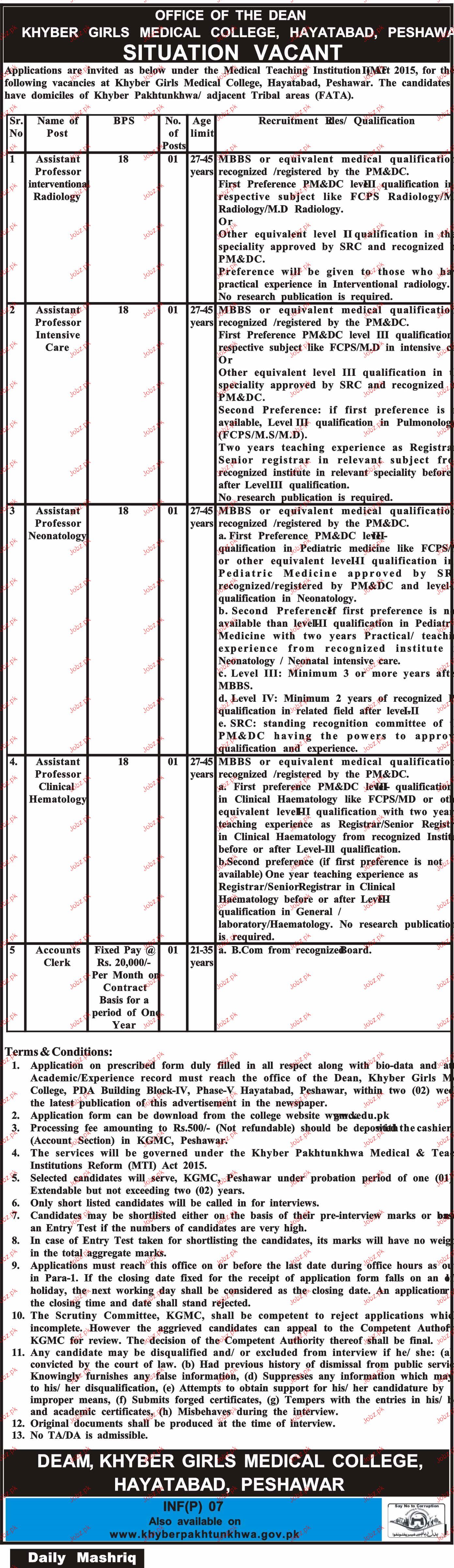 Latest Khyber Girls Medical College Teaching Posts Peshawar 2025
