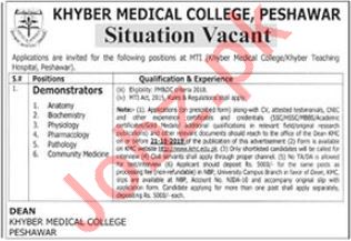 Medical, health, mbbs, doctors and qualified candidates for the positions of Anatomy Demonstrator, Biochemistry Demonstrator, Physiology Demonstrator, Pharmacology Demonstrator, Pathology Demonstrator and Community Medicine Demonstrator required for Khyber Medical College / Khyber Teaching Hospital, Medical Teaching Institution MTI in Peshawar KPK 2019.