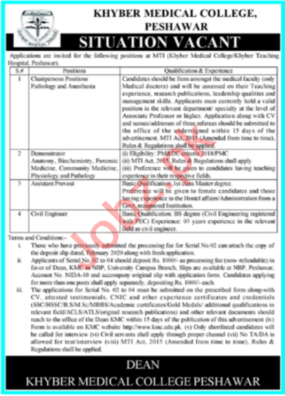 Chairperson, Demonstrator, Assistant Provost, Civil Engineer, Engineer, Demonstrator Anatomy, Demonstrator Biochemistry, Demonstrator Forensic Medicine, Demonstrator Community Medicine, Demonstrator Physiology, Demonstrator Pathology needs in Khyber Medical College KMC MTI.