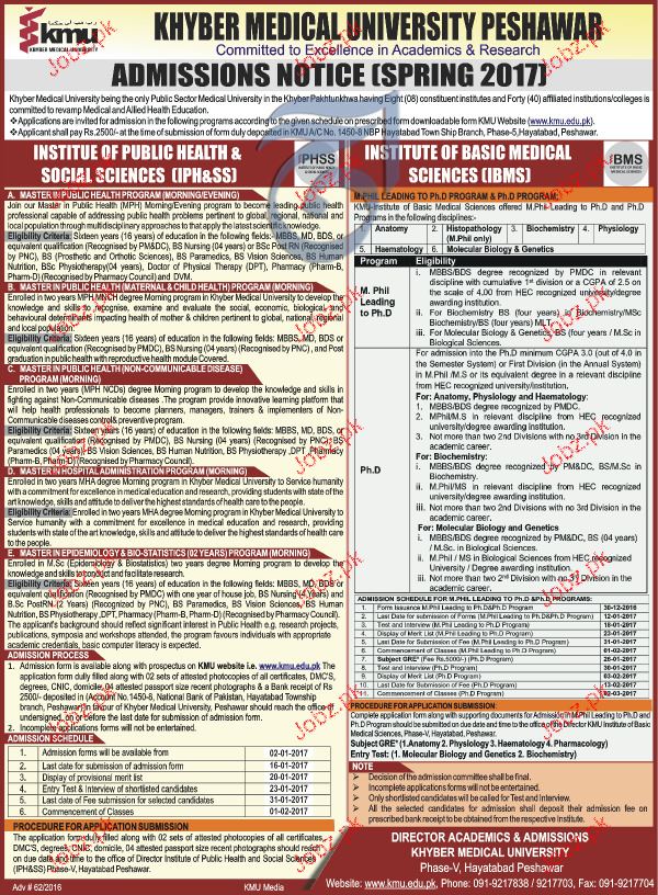 Khyber Medical University Admission in Mphill and Phd in Peshawar. Read newspaper ad for exact details.