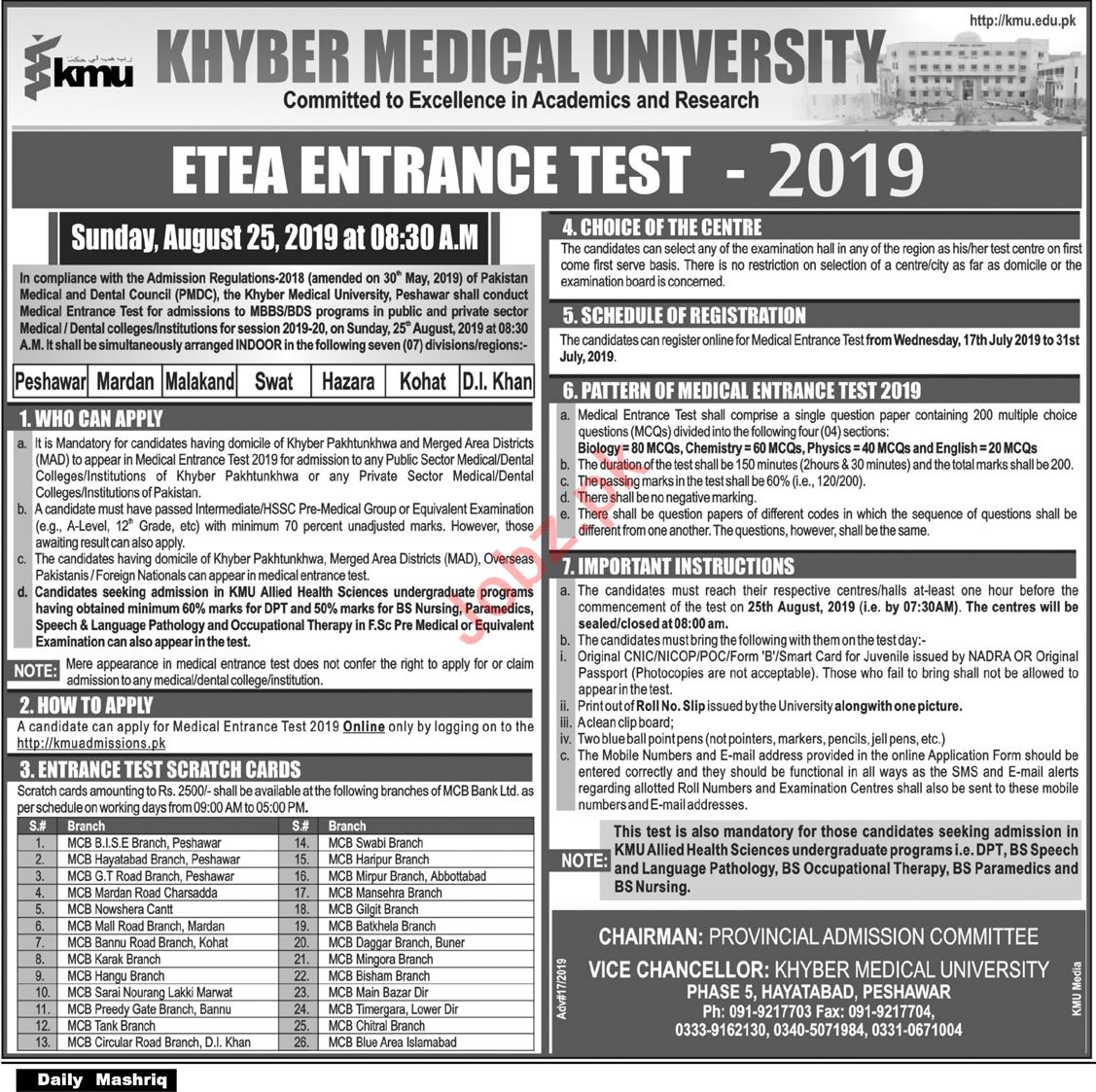 Khyber Medical University KMU Peshawar, Pakistan are started admissions fall 2019 for the classes of MBBS Bachelor of Medicine, Bachelor of Surgery & BDS . Read newspaper ad for exact details.