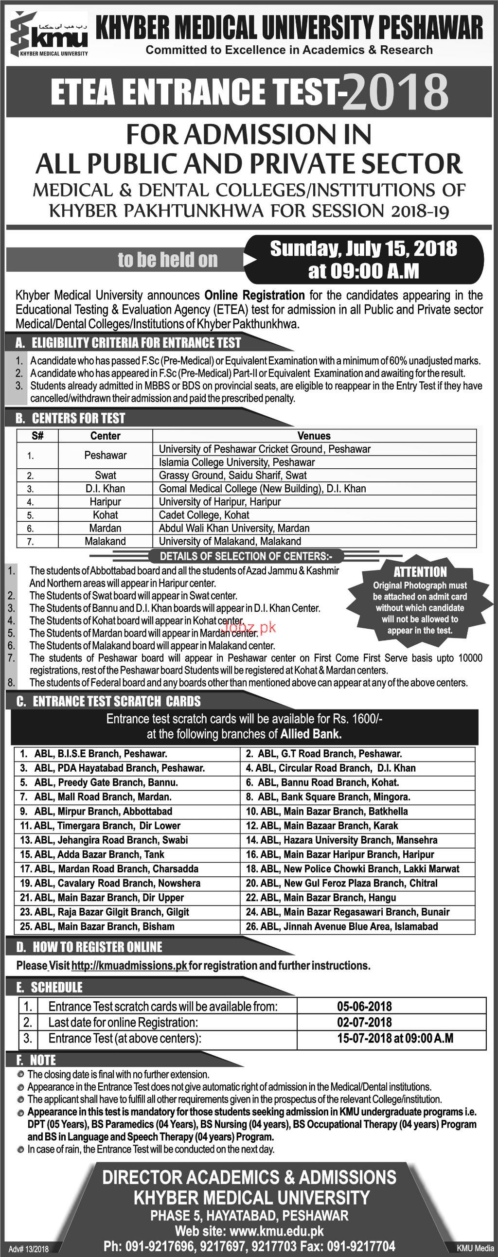 Khyber Medical University Peshawar Admission in ETEA Entrance Test 2018 For Admission in all public and Private Sector Medical & Dental Colleges / Institutions of KPK For session 2018 in Peshawar. Read newspaper ad for exact details.