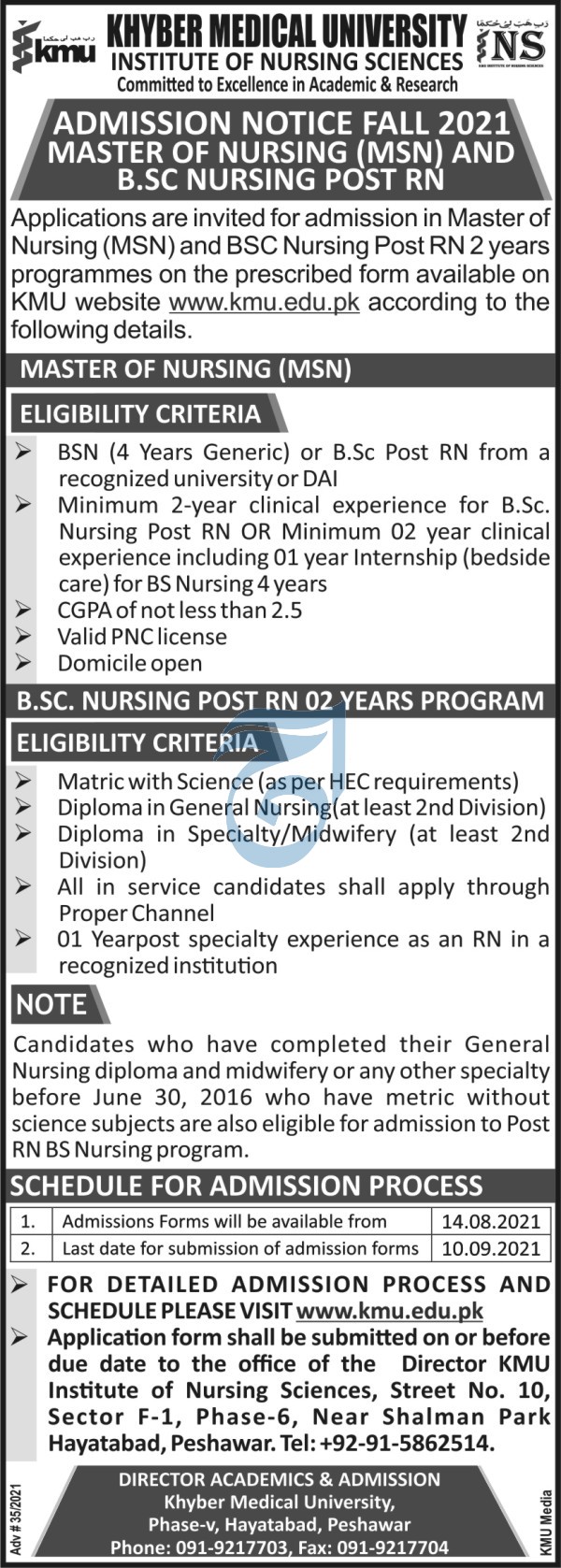 Khyber Medical University is a public research university invites applications for admissions in Master of Nursing MSN and BSc Nursing Post RN in Peshawar KPK 2021. Read newspaper ad for exact details.