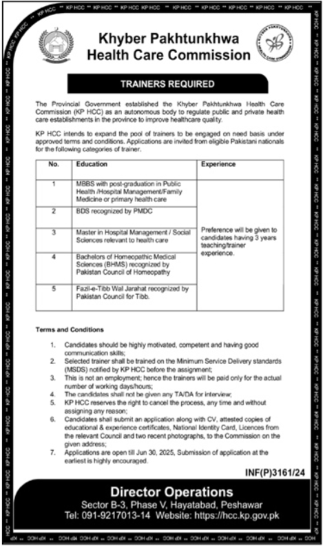 Khyber Pakhtunkhwa Healthcare Commission jobs advertisement dated about 29 November 2024 in daily Mashriq Newspaper invites application for the vacant post of trainer in Peshawar, peshawar Khyber Pakhtunkhwa KPK Pakistan. Educational qualifications required Bachelor, MBBS, Master and BDS etc.