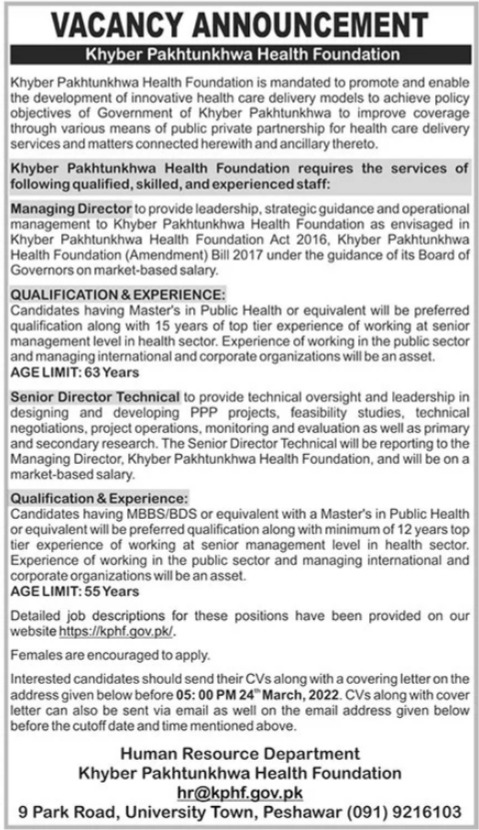 Khyber Pakhtunkhwa Health Foundation Peshawar, peshawar Khyber Pakhtunkhwa KPK Pakistan invites applications from eligible candidates for the post of director technical and managing director as per advertisement of March 11, 2022 published in daily The News Newspaper. MBBS, Master and BDS etc. educational qualification will be preferred.