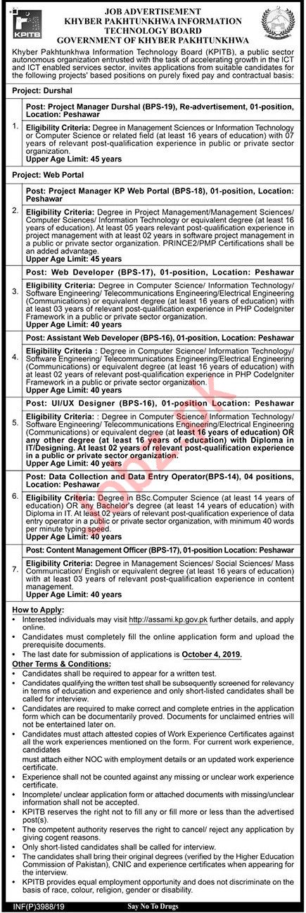 Vacancies in Khyber Pakhtunkhwa Information Technology Board KPITB Advertisement September 2019