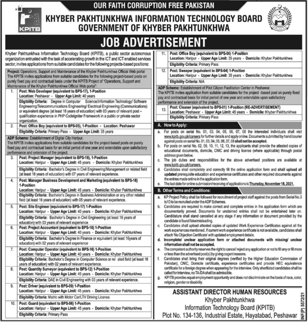 khyber Pakhtunkhwa Information Technology Board KPITB Peshawar seeks services for Web Developer, Office Boy, Project Manager, Manager Business Development and Marketing, Site Engineer, Project Accountant, Computer Operator, Quantity Surveyor, Driver, Guard, Office Boy, Sweeper, Cleaner.