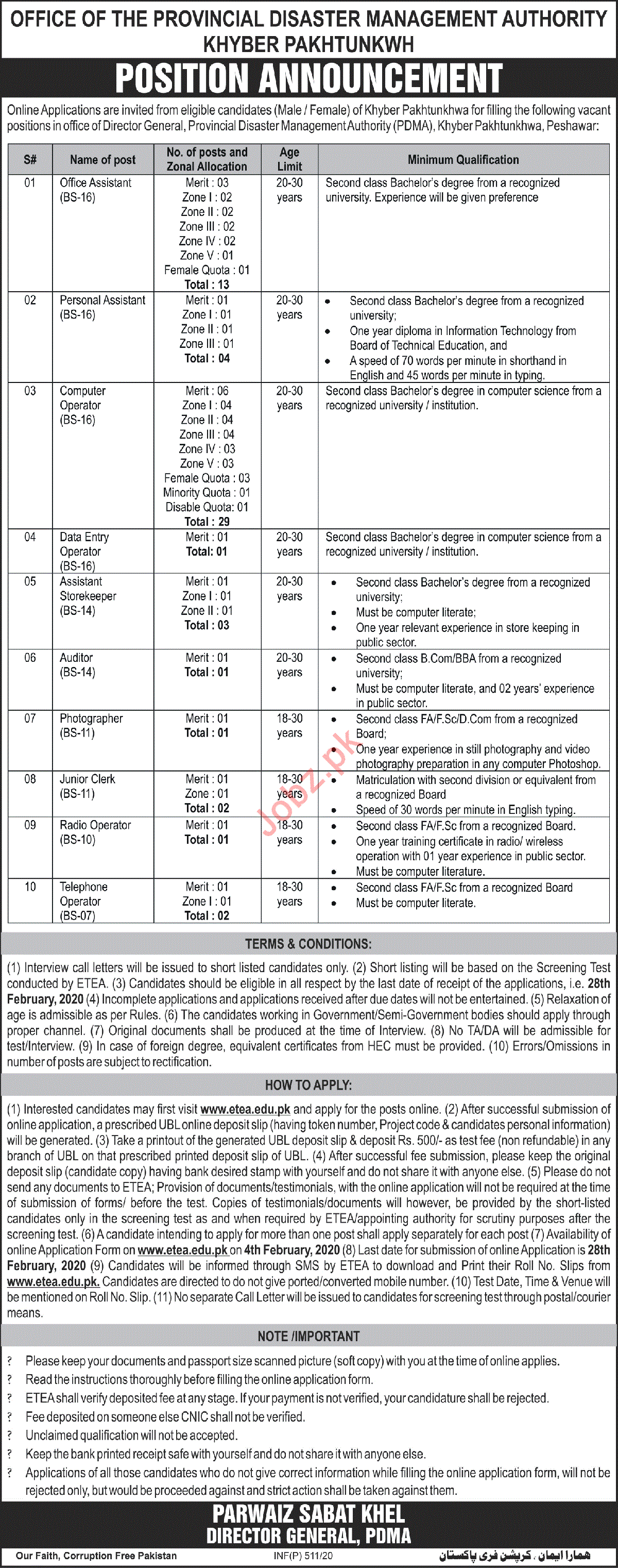 Provincial Disaster Management Authority PDMA intends to hire qualified and experienced persons for the posts of Office Assistant, Personal Assistant, Computer Operator, Data Entry Operator DEO, Assistant Storekeeper, Auditor, Photographer, Junior Clerk, Radio Operator and Telephone Operator in Peshawar Khyber Pakhtunkhwa KPK via Educational Testing and Evaluation Agency ETEA 2020.