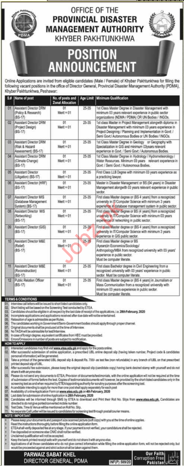 Provincial Disaster Management Authority PDMA intends to hire qualified and experienced individuals for the positions of Assistant Director DRM Policy, Assistant Director DRM Research, Assistant Director DRM Project Design, Assistant Director DRM Risk Assessment, Assistant Director DRM Hazard Assessment, Assistant Director Litigation, Assistant Director HRF, Assistant Director MIS Database Management System, Assistant Director MIS Networking, Assistant Director GIS, Assistant Director Monitoring, Assistant Director Evaluation, Assistant Director Reconstruction, Assistant Director Relief and Public Relation Officer in Peshawar through Educational Testing and Evaluation Agency ETEA 2020.