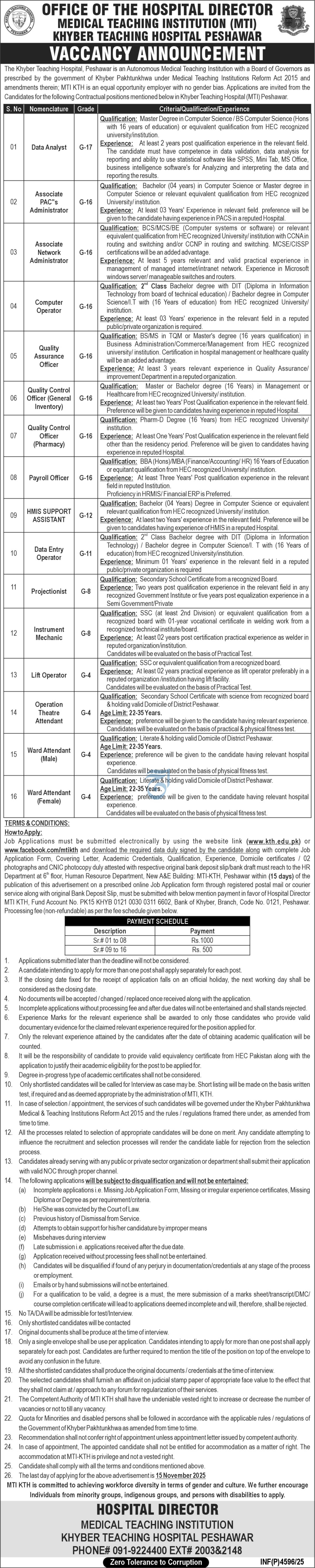Vacant posts including quality control officer, operation theatre attendant, projectionist, ward attendant, lift operator, computer operator, data entry oeprator, payroll officer, instrument mechanic, data analyst, hmis support assistant, associate network administrator, quality assurance officer and associate pacs administrator are announced in Khyber Teaching Hospital Peshawar, peshawar Khyber Pakhtunkhwa KPK Pakistan as per 29 October 2025 advertisement in daily Aaj Newspaper. MS, Intermediate, Master and Bachelor etc. educational qualification will be preferred.