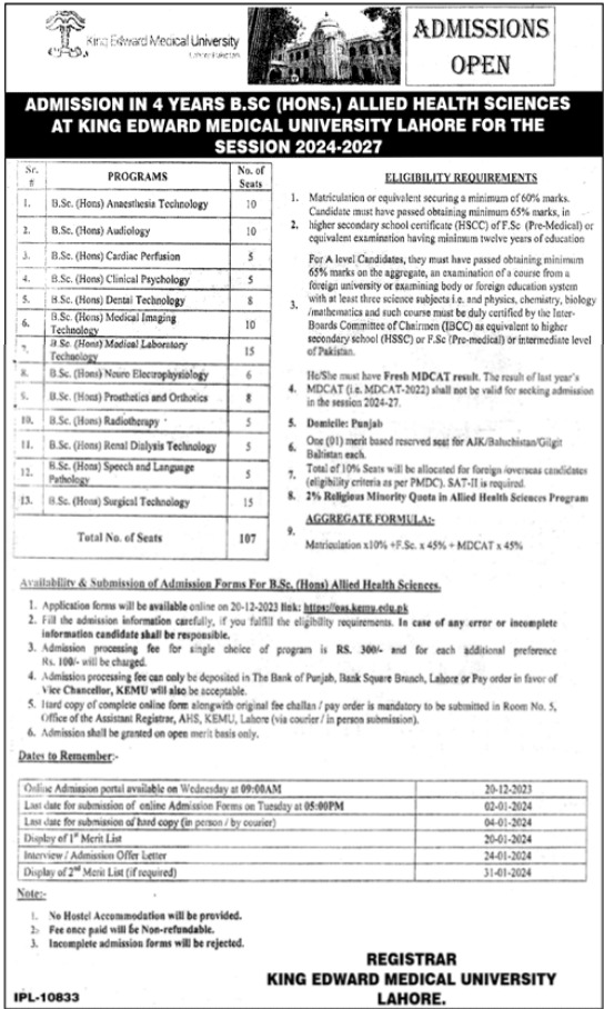 King Edward Medical University admissions 2023 for Bsc Honors Degree Program has been announced. Students who want to take admissions in King Edward Medical University Lahore Punjab Pakistan for academic year 2023 to continue education in Science University can apply. Students for admissions in BSc Hons can apply for online or campus classes as per Government institute criteria till admission closing date January 20, 2024. Read newspaper ad for exact details.