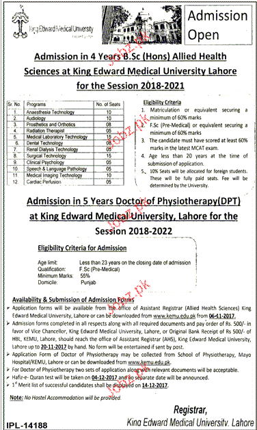 King Edwards Medical University Lahore Admission in BSc Hons and Doctor Physiotherapy DPT Fice year Programs For Session 2017 and 2018 in Lahore. Closing date is 06-112017. Read newspaper ad for exact details.