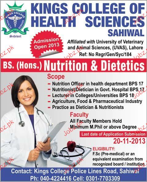 Kings College of Health Sciencs Admission in BS Hons in Sahiwal Read newspaper ad for exact details.