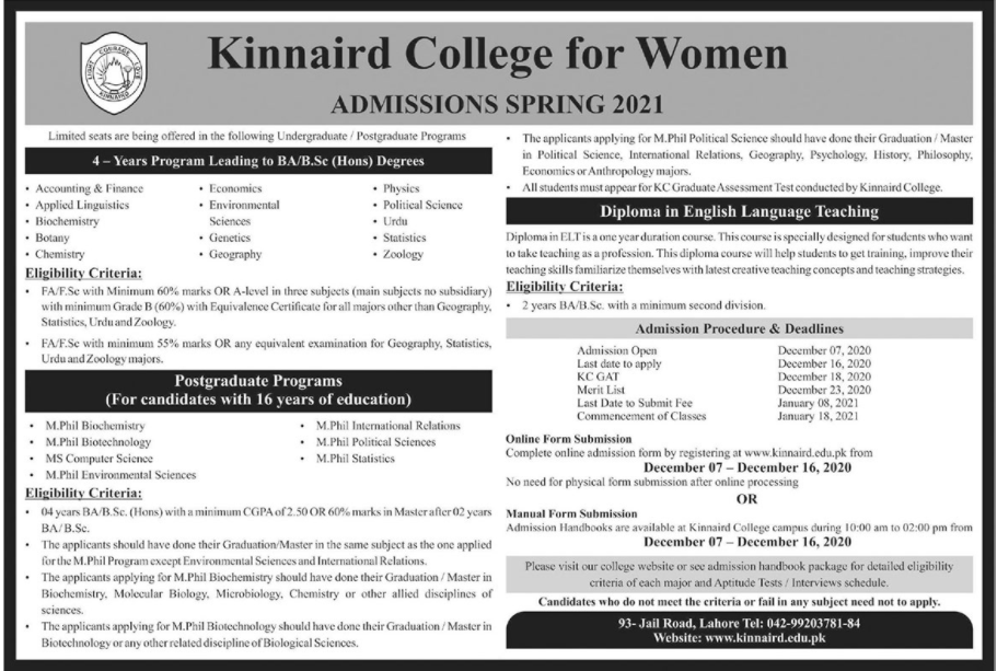 Kinnaird College for Women invites applications for admissions in BA Hons, BSc Hons, Postgraduate, M.Phil and Diploma in English Language Teaching in Lahore. Read newspaper ad for exact details.