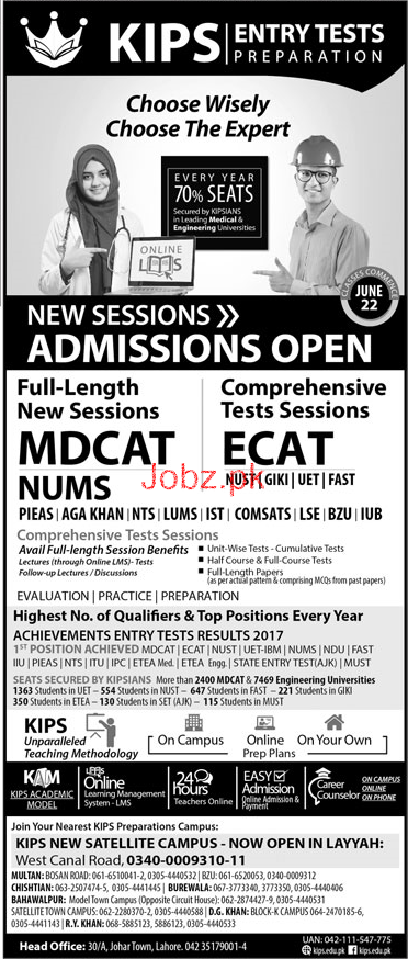 KIPS Academy Admission in Entry Test preparation Full Length New Session MDCAT and ECAT Comprehensive Tests Session in Layyah Campus. Admission Open for Both Male / Female Students Read newspaper ad for exact details.
