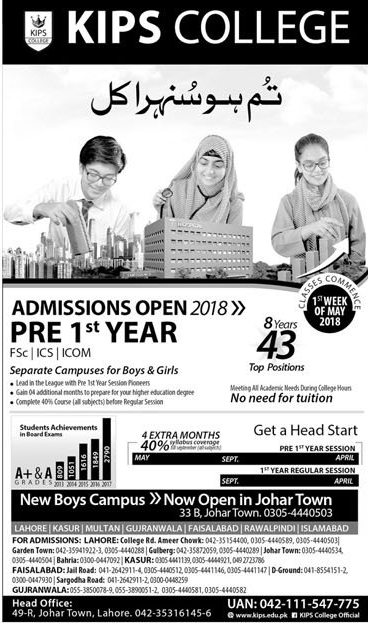KIPS College Admission in Class XI Fsc, ICs and I.COm in L Johar Town in Lahore. Admission session 2018-2019. Admission Open for Both Male / Female Students Read newspaper ad for exact details.