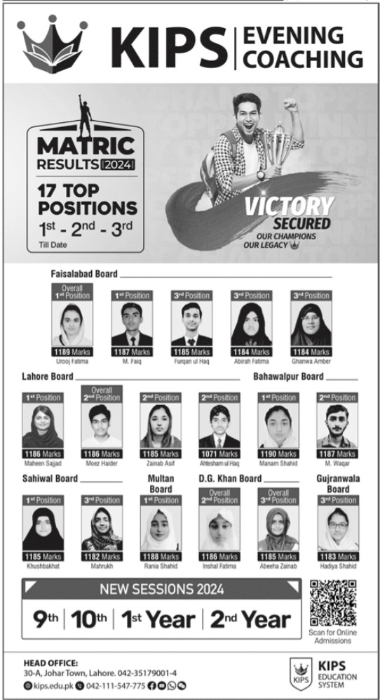 KIPS Education System Class 9th, Class 10th, 1st Year, 2nd Year admissions 2024 has been announced. Students can enroll for admissions in KIPS Education System Lahore Punjab Pakistan for academic year 2024 to continue campus based or online education in Teaching College. Eligible students for fulfilling criteria for admissions in Matric and Intermediate can enroll as per Private admission policy 2024 till closing date 28 July 2024. Read newspaper ad for exact details.