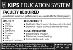 Latest KIPS Education System Teaching Posts Lahore 2025
