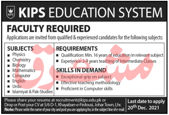 KIPS Education System invites applications from highly educated expert and experienced professionals for the post of Teacher, Physics Teacher, Chemistry Teacher, Biology Teacher, Mathematics Teacher, Computer Teacher, English Teacher, Urdu Teacher, Islamiyat Teacher, Pakistan Studies Teacher in Lahore.