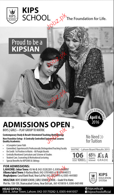 KIPS School Admission in Play Group to Matric in Lahore. Read newspaper ad for exact details.