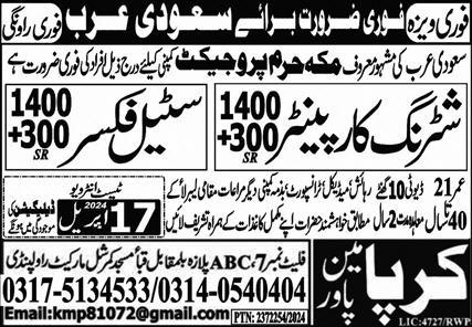 Kirpa Manpower Services invites applications for job positions advertised in daily Express dated 15 April 2024 for following vacancies in Riyadh, riyadh Saudi Arabia.
