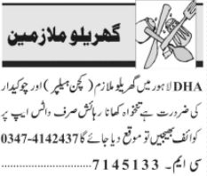 House jobs advertisement dated about 26 April 2024 in daily Jang Newspaper invites application for the vacant post of chowkidar, watchman and kitchen helper in Lahore, lahore Punjab Pakistan. Persons with Middle and Primary etc. education can apply.
