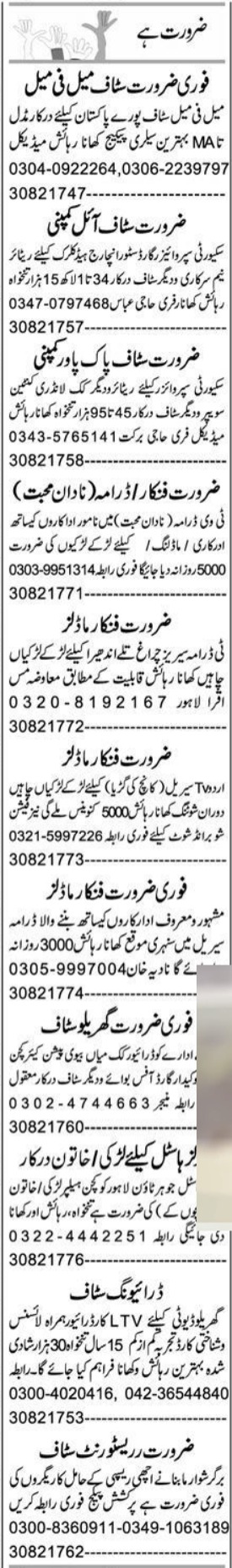 Vacant posts including female office staff, kitchen helper, chowkidar, store incharge, husband wife, office staff, driver, restaurant worker, model, actor, chef, cook, patient care, security supervisor, sweeper, office boy, ltv driver, security guard, head clerk and guard are announced in Private Company Lahore, lahore Punjab Pakistan as per 14 July 2022 advertisement in daily Express Newspaper. Middle, Intermediate, Matric and Bachelor etc. educational qualification will be preferred.