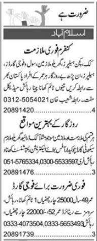 Private Company jobs advertisement dated about 6 April 2023 in daily Express Newspaper invites application for the vacant post of receptionist, fauji guard, chowkidar, helper, kitchen helper, civil guard, driver, cook, electrician, security guard and house worker in Islamabad, rawalpindi Islamabad Pakistan. Preferred Education is Intermediate, Matric, Middle and Bachelor etc.