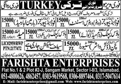 Farishta Enterprises Oversea Employment Promoters invites applications for job positions advertised in daily Express dated 11 January 2024 for following vacancies in Ankara, istanbul Turkey.